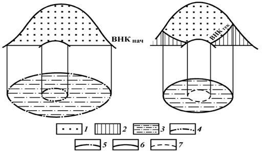 Рис. 104. Схема изменения формы поверхности ВНК при соотношении вязкости нефти и воды. Коллектор: 1 — нефтенасыщенный, 2 — заводненный; 3 — водонефтяная зона; контуры нефтеносности: 4 — внутренний начальный, 5 — внешний начальный, 6 — внешний текущий, 7 — внутренний текущий