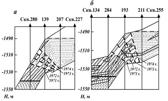 Рис. 105. Схематические геологические профили газонефтяной залежи Коробковского месторождения (), представленной монолитным и расчлененным пластами. Контакты: 1 — начальный водонефтяной, 2 — начальный газонефтяной, 3 — текущий водонефтяной на 1 января соответствующего года; 4 — заводненная закачиваемой водой часть нефтенасыщенного пласта; 5 — водонасыщенный пласт; 6 — непроницаемые прослои