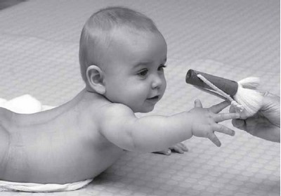 Когда ребенок лежит на животе, он может касаться вещей, которые находятся рядом с ним, хватать их, играть с ними, двигать их взад и вперед и нажимать на них. Так он познает окружающий мир. Вспомните, как в первые три месяца вы показывали малышу игрушку. Теперь он не только следит за ней глазами – он еще поворачивает голову в ее сторону. Попробуйте двигать игрушку быстрее и держать дальше от ребенка. Поднимите ее повыше, чтобы и ребенок как можно выше задрал головку. Мы протягиваем игрушку ребенку, лежащему на животе. Он перемещает свой вес на живот и одну ручку, а другой хватает игрушку. Он может балансировать в этом положении несколько секунд. Он может потащить игрушку в рот и попробовать, какова она на вкус. Сколько играть одной и той же игрушкой, определяет сам ребенок. Если игрушка откатится в сторону и ребенок за ней потянется, помогите ему. В конце первых шести месяцев ребенок может уже опираться руками. Руки вытянуты, голова поднимается высоко. Он может опереться одной рукой, а вторую протянуть за игрушкой. Чаще всего он делает это только с одной стороны.