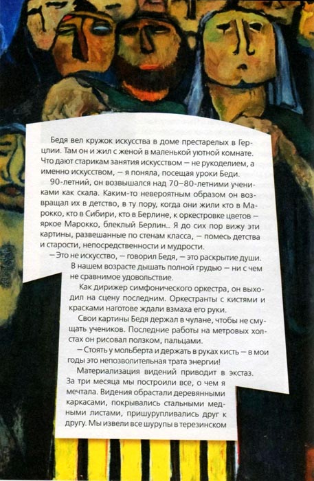 Бедя вел кружок искусства в доме престарелых в Герцлии. Там он и жил с женой в маленькой уютной комнате. Что дают старикам занятия искусством – не рукоделием, а именно искусством, – я поняла, посещая уроки Беди. 90‑летний, он возвышался над 70‑80‑летними учениками как скала. Каким‑то невероятным образом он возвращал их в детство, в ту пору, когда они жили кто в Марокко, кто в Сибири, кто в Берлине, к оркестровке цветов – яркое Марокко, блеклый Берлин… Я до сих пор вижу эти картины, развешанные по стенам класса, – помесь детства и старости, непосредственности и мудрости. – Это не искусство, – говорил Бедя, – это раскрытие души. В нашем возрасте дышать полной грудью – ни с чем не сравнимое удовольствие. Как дирижер симфонического оркестра, он выходил на сцену последним. Оркестранты с кистями и красками наготове ждали взмаха его руки. Свои картины Бедя держал в чулане, чтобы не смущать учеников. Последние работы на метровых холстах он рисовал ползком, пальцами. – Стоять у мольберта и держать в руках кисть – в мои годы это непозволительная трата энергии!