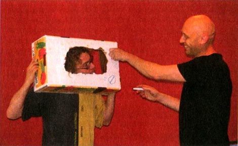 – К вашим услугам – живой телевизор. Семья Шварценеггеров, на сцену!.. Нет Шварценеггеров? Может, есть семья с другой фамилией? – Есть!!! – Ура! Поприветствуем семью с другой фамилией! Зал аплодирует. Федька нахлобучил на себя коробку, высунул голову. Говорит на английском. Никто не понимает. Переключает ручку – на китайском. Переключает снова – на испанском. Все умирают со смеху.