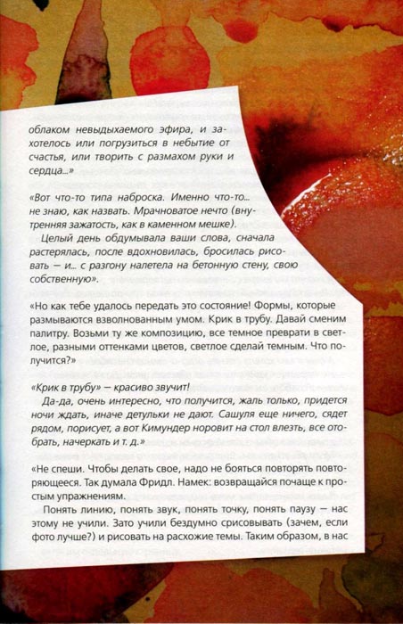«Не спеши. Чтобы делать свое, надо не бояться повторять повторяющееся. Так думала Фридл. Намек: возвращайся почаще к простим упражнениям. Понять линию, понять звук, понять точку, понять паузу – нас этому не учили. Зато учили бездумно срисовывать (зачем, если фото лучше?) и рисовать на расхожие темы. Таким образом в нас притупили и дар восприятия красоты. В лучшем случае утешили нас тем, что все субъективно. Один любит кофе, другой – чай, слить вместе – выйдет бурда. Незнание нот не мешает наслаждаться музыкой. Но не чувствуя гармонии, ею невозможно наслаждаться. Гармония – это совершенная композиция, это не сложенность, а слитность. В изобразительном искусстве – слитность линии, цвета и формы. Композиция!»