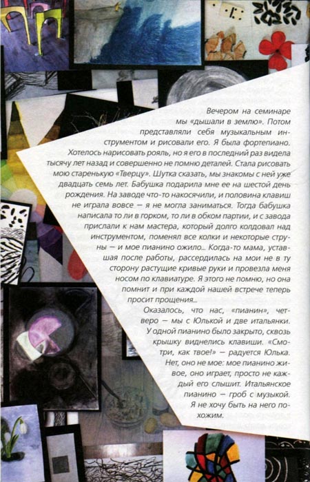 Вечером на семинаре мы «дышали в землю». Потом представляли себя музыкальным инструментом и рисовали его. Я была фортепиано. Хотелось нарисовать рояль, но я его в последний раз видела тысячу лет назад и совершенно не помню деталей. Стала рисовать свою старенькую «Тверцу». Шутка сказать, мы знакомы с ней уже двадцать семь лет. Бабушка подарила мне ее на шестой день рождения. На заводе что‑то накосячили, и половина клавиш не играла вовсе – я не могла заниматься. Тогда бабушка написала то ли в горком, то ли в обком партии, и с завода прислали к нам мастера, который долго колдовал над инструментом, поменял все колки и некоторые струны – и мое пианино ожило… Когда‑то мама, уставшая после работы, рассердилась на мои не в ту сторону растущие кривые руки и провезла меня носом по клавиатуре. Я этого не помню, но она помнит и при каждой нашей встрече теперь просит прощения… Оказалось, что нас, «пианин», четверо – мы с Юлькой и две итальянки. У одной пианино было закрыто, сквозь крышку виднелись клавиши. «Смотри, как твое!» – радуется Юлька. Нет, оно не мое: мое пианино живое, оно играет, просто не каждый его слышит. Итальянское пианино – гроб с музыкой. И я не хочу быть на него похожим. Делимся на группы и делаем скульптуру музыканта, играющего на инструменте. Юлька не говорит по‑английски – итальянки не понимают ее немецкий. Решаем, что они будут делать куклу, а мы с Юлькой – инструмент. Но я не хочу делать инструмент: я боюсь Юльку, она взрослая и все умеет, да и пианино из коробки – не мое пианино. Это как портрет Е. Г. моими руками рисовать. Ухожу к итальянкам делать куклу… Когда все готово, приходит дирижер Лука и включает пьесу, где каждый инструмент оркестра вступает отдельно, а потом сливается с остальными. Какое счастье, что пьеса короткая: еще одного погружения в музыку я бы не выдержала. После семинара иду рисовать свой плоский дом. В отеле дорисовываю начатые утром крыши, потом падаю на кровать и засыпаю. Второй день семинара. Уставшая Лена. Работаем с детскими рисунками из Терезина. Многие из них мне хорошо знакомы. Хотела найти цветы маленькой Эрики, но меня опередила Алена. Мне достается коллаж по Вермееру, выполненный Соней Шпицевой, и я ухожу к себе в угол. Бегать и искать материалы нет ни сил, ни желания; беру пару белых листов (один толстый, другой тонкий), лист бежевой бумаги для фона и акварель. Кома в горле, о котором вспоминали многие семинаристы, у меня нет: Соня вместе с другими терезинскими детьми давно уже внутри меня – я просто делаю заданную работу, стараясь попасть в Сонино состояние. – Ты собираешься все квадратики наклеить? – Ленин голос за спиной. Оказывается, я не укладываюсь во время. Нет, все‑таки уложилась. Потом мы работали со щетками по Фридл. Это задание тоже давным‑давно пережито, и я работаю спокойно. Рисую быстро – Лена предлагает слепить из глины. Леплю. Закончив, ухожу мыть руки. Встречаю Лену. – Слепила? Пойдем посмотрим. Моя злополучная щетка, не очищенная от глины, валяется в углу вместе с вылепленной. – Тут постамента не хватает. Уважать надо предмет, натуру уважать… Неуверенно пытаюсь что‑то поправить. Уважения к щетке у меня действительно нет – мне неинтересно, я только честно выполняю задание, не впуская его внутрь (там и так тесно, как в аквариуме с омарами). – Подожди, не трогай. Смотри! – и Лена начинает л