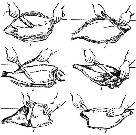 Рис. 12. Обробка камбали: 1 — обчищання луски; 2 — відрізування голови; 3 — видалення нутрощів; 4 — відрізування плавників; 5 — знімання шкіри; 6 — пластування.