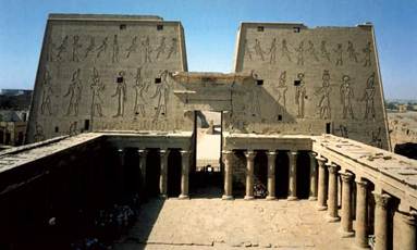 97. Храм Гора в Эдфу. Синтез архитектурно-пластических форм был присущ храму в Эдфу. Ритуальная символика нашла свое совершенное воплощение в храме богини Хатор в Дендере. Потолок зала был расписан изображениями зодиакальных созвездий и богини неба Нут, представленной в виде женской фигуры, перекинутой через небесный свод. Необычайно красиво были решены колоннады внутри святилища. Гробницы частных лиц также следовали древнеегипетскому ритуалу, но в планировке усыпальниц египетские элементы сочетались с греческими. Например, гробница верховного жреца бога Тота - Петосириса, обнаруженная в Среднем Египте недалеко от Гермополя, датируемая концом IV в. до н.э. состояла из двух помещений. Фасад ее был отмечен колонным портиком с нишами, доходящими по высоте до середины колонн, увенчанных сложными многоярусными капителями. Проход в погребальную камеру с саркофагом пролегал через колонный зал.