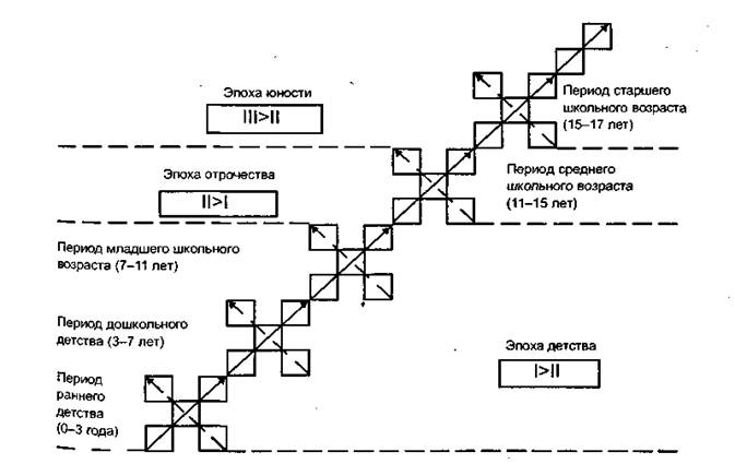 Источником развития личности, согласно мнению А.В. Петровского, выступает противоречие между потребностью индивидуума в персонализации (быть личностью) и объективной заинтересованностью референтной для него общности принимать лишь те проявления его индивидуальности, которые соответствуют задачам, нормам и условиям функционирования и развития в этой общности. Для успешной адаптации к новой общности на каждом возрастном этапе важна успешная интеграция на предыдущей стадии. В целом многоступенчатая схема периодизации по А.В. Петровскому с выделенными автором эпохами, периодами изображена на схеме ниже.