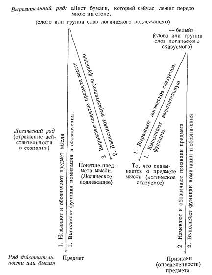 общения людей. Если бы речь и ее части не выполняли указанных в схеме функций, то оставалось бы неизвестным, о чем и что думает говорящий и пишущий, т. е. поль- зующийся языковыми средствами, и язык не миг бы быть средством общения. Конечно, мы этим не хотим сказать, что указанными в схеме функциями исчерпываются функции речи и ее частей. Наряду с ними речь и ее части выполняют функции выражения отношения говорящего и пишущего к тому, о чем он или что он сообщает (верит, не верит, убежден, не убежден, сомневается, не сомневается и т. д.), выполняют функции выражения эмоциональных и волевых состояний говорящего и пишущего, выражения характера и вкуса автора и т. д. (экспрессивная в узком смысле, стилистическая и другие функции). Соответственно и язык, будучи средством общения, вместе с тем есть средство выражения не только мыслей, но также.эмоциональных и волевых состояний, характера и т. д. того, кто пользуется языком. Само собою разумеется, что приведенная схема не является какой-то попыткой «оторвать», «отделить», «изолировать» различные элементы выражения по его смысловым функциям, элементы мысли и элементы действительности. Смысл схемы состоит в наглядном изображении того, что в первую очередь необходимо с логической точки зрения различать в анализе смысловой структуры предложения, а без различения вообще нет знания. Кстати, эта схема может кое-что уяснить и в философском противопоставлении материалистического истолкования познавательного значения речи и языка идеалистическому. В самом деле, для номинализма как средневекового (В. Оккам), так и для современного фундирующим, или определяющим, рядом является выразительный ряд языковых знаков, который своими функциями создает логический ряд оформленных через язык содержаний мысли, а этот ряд вносит порядок в чувственные данные и тем самым порождает объекты и связи бытия, т. е. конструирует то, что мы называем общим или всеобщим в действи-" тельности и что с точки зрения последовательного номинализма следует называть продуктом языка. Для концептуалиста фундирующим рядом является логический ряд (у Канта—трансцендентальная логика), который порождает действительность объектов и их связей (в этом сходство концептуализма с последовательным номинализмом), и язык с его функциями (в этом отличие концептуализма от номинализма, для которого, как сказано, логический ряд определяется знаковым рядом). Для материализма фундирующим, определяющим рядом является объективная действительность, существующая в ее единичных фактах и в закономерных общих связях независимо от чьего бы то 'ни было сознания. Эта действительность с появлением сознания получает верное или искаженное отражение в последнем. Это отражение может иметь чувственную или логическую форму. Логическую 'форму оно приобретает на базе языка и одновременно с ним, ибо нет мысли без речи и система языковых средств не может существовать, если нет того процесса отражения действительности в сознании, который мы называем мышлением, и тех его содержаний, которые мы называем мыслями. В приведенной схеме не хватает обозначения того элемента формы мысли, который мы назвали соотнесением состава мысли с действительностью и который вместе с тем связывает выделенные г схеме элементы логического ряда. Этот элемент мог бы быть отнесен к сост