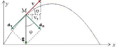 Рис. 2.7.2. Найдем, для примера, радиус кривизны параболы в некоторой точке M. Парабола – это траектория движения тела, брошенного под углом к горизонту (см. рис. 2.7.2). Ускорение тела a = g можно представить как сумму нормального и тангенциального ускорений: g = a n + a t. Т.к. Date: 2015-05-19; view: 753; Нарушение авторских прав |