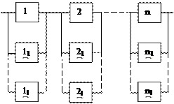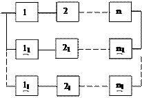 Расчет количественных характеристик надежности систем с резервированием отдельных элементов или групп элементов во многом определяется видом резервирования. Ниже рассматриваются схемы расчетов для самых распространенных случаев простого резервирования, к которым путем преобразований может быть приведена и структура смешенного резервирования. При этом расчетные зависимости получены без учета надежности переключающих устройств, обеспечивающих перераспределение нагрузки между основными и резервными элементами (т.е. для “идеальных” переключателей). В реальных условиях введение переключателей в структурную схему необходимо учитывать и в расчете надежности систем. Расчет систем с нагруженным резервированием осуществляется по формулам последовательного и параллельного соединения элементов аналогично расчету комбинированных систем (п. 3.5). При этом считается, что резервные элементы работают в режиме основных как до, так и после их отказа, поэтому надежность резервных элементов не зависит от момента их перехода из резервного состояния в основное и равна надежности основных элементов.Для системы с последовательным соединением n элементов (рис. 2.1) при общем резервировании с кратностью l (рис. 4.1, а)