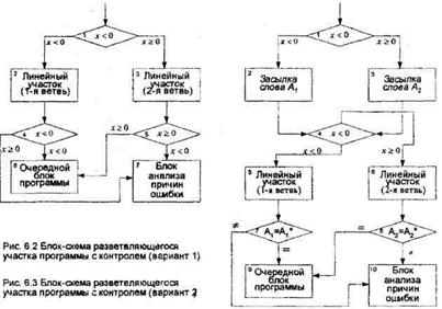 Здесь имеются два узла разветвления - блоки 1 и 4. После выполнения первого разветвления в заранее выбранную ячейку памяти засылается одно из слов: А1 или А2. Второй узел обеспечивает выход в одну из ветвей программы. В каждой из ветвей осуществляется проверка условия А1 = А*1 или а2 = А*2 где А*1 и а*2 - контрольные значения А1 и А2. Если происходит совпадение слов, то переходят к блоку 9, если несовпадение - к блоку 10. Проверку факта реализации только одной из ветвей разветвления можно осуществить следующим образом. В оперативной памяти выбирается контрольная ячейка, в которую до выполнения разветвляющегося участка засылается нулевое слово. Каждой ветви в этой ячейке ставится в соответствие один разряд. В процессе выполнения ветви предусматривается засылка единицы в этот разряд. Очевидно, после правильного выполнения разветвляющегося участка в контрольной ячейке должна быть единица только в одном из разрядов. Описанные методы контроля правильности выполнения разветвляющихся участков программ целесообразно применять, когда отдельные ветви содержат достаточно большое число команд, иначе контрольные операции существенно увеличат объем программы и время ее реализации. Эти методы нечувствительны к ошибкам, возникшим в результате отказов, но последствия сбоев обнаруживают с высокой достоверностью.