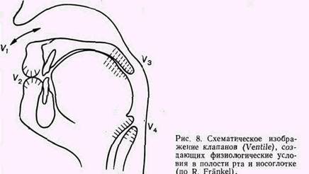 между зубными рядами, особенно во время глотания Нагрузка, приходящаяся на нижние передние зубы, предотвращает дальнейшее зубоальвеолярное удлинение. Восстановление миодинамическо-го равновесия приводит к исправлению формы зубных дуг и установлению новой высоты прикуса Это в свою очередь способствует увеличению высоты нижней части лица и восстановлению гармонии его черт. Однако описанные изменения наступают постепенно как результат приспособления к изменившимся миодинамическим условиям Размер и форма оральной и назофарингиальной полостей должны находиться в соответствующих соотношениях Дыхательный и пищеварительный пути сообщаются между собой в области носоглотки. Нормальные дыхание и глотание осуществляются под воздействием физиологических коррелирующих механизмов При этом функции контроля осуществляют различные вентили — мышечные барьеры (рис. 8). Первостепенное значение имеет дыхание (вентиль 1). Заслуживает внимания наличие контактов между губами (вентиль 2), а также между корнем языка и мягким небом (вентиль 3). Последний барьер отделяет полость рта от глотки, его пе-р^еднезаднее расположение определяет ширину глоточного пространства, важного для дыхания. Следовательно, имеется тесная связь между системой дыхания и функцией мышц этого барьера. Расположение корня языка и мягкого неба находится под регулирующим влиянием центра дыхания. Пользование регулятором функций при дистальном прикусе вырабатывает положительные навыки. Так, пациент должен охватить нижней губой пелоты, выдвинуть нижнюю челюсть и вместе с нею корень языка. При разговоре, особенно громком, он должен, охватив пелоты нижней губой, привести губы в соприкосновение. 7. ПРИНЦИП ДЕЙСТВИЯ РЕГУЛЯТОРОВ ФУНКЦИЙ, ИХ КОНСТРУКЦИИ И ТЕХНОЛОГИЯ ИЗГОТОВЛЕНИЯ Морфологические и функциональные изменения в зубочелюстной системе на определенных этапах развития аномалий прикуса можно считать компенсаторно приспособительными. При декомпенса-