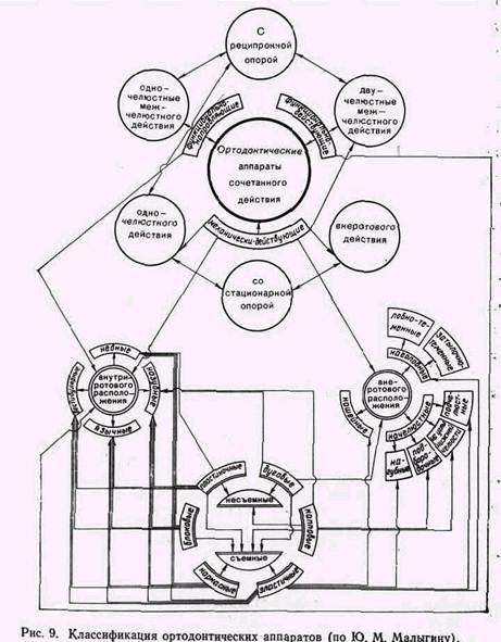 ции процессы адаптации к нарушенной функции не исчезают. Наблюдается порочный круг: функциональные нарушения усугубляют морфологические, а последние затрудняют нормализацию функций мышц. Устойчивость результатов лечения аномалий прикуса зависит не только от устранения морфологических отклонений, но и от нормализации функций мышц, окружающих зубные ряды. Разнообразие зубочелюстных аномалий потребовало создания многочисленных ортодонтических аппаратов. Были классифицированы основные конструкции аппаратов с учетом биофизических принципов их действия и конструктивных особенностей [Хорошил-кина Ф. Я., Малыгин Ю. М. 1977] (рис. 9). 7.1. ПРИНЦИП ДЕЙСТВИЯ РЕГУЛЯТОРОВ ФУНКЦИЙ Учитывая значение функциональных нарушений в развитии зубочелюстных аномалий, R. Frankel (1960) предложил метод лечения аномалий прикуса, суть которого заключается в устранении давления губ и щек на альвеолярные отростки и зубные ряды в участках их недоразвития, а также в нормализации смыкания губ, положения языка, щек, их функций и взаимоотношений. Для этой цели им создан специальный ортодонтический аппарат, который назван регулятором функций. Как и любой другой аппарат, его можно охарактеризовать по следующей схеме: — по принципу действия — функционально действующий; — по месту и способу действия — двухчелюстной межчелюстного действия; — по виду опоры — реципрокный (взаимодействующий); — по месту расположения — внутриротовой вестибулярный; — по способу фиксации — съемный; — по виду конструкции — каркасный. Регулятор функций Френкеля состоит из двух щечных щитов и двух губных пелотов из пластмассы, соединенных между собой металлическим каркасом — небным бюгелем, лингвальной и вестибулярной дугами и другими деталями. Основное внимание в процессе лечения направляется на тренировку мышц, которая достигается быстрее при круглосуточном пользовании аппаратом. Для достижения этой цели автор скелетировал вестибулярную пластинку. Введение в конструкцию жесткого металлического каркаса позволило повысить ее прочность, значительно уменьшить размеры щитов из пластмассы, облегчить аппарат, сделать его открытым в переднем участке для обеспечения глотания и речи. Благодаря такой конструкции регулятор функций имеет учебно-тренировочное назначение и оказывает физиотерапевтическое воздействие на ткани полости рта. Им можно пользоваться не только ночью, но и днем, когда нейромоторные процессы в челюстно-лицевой области протекают интенсивнее и воздействовать на них можно более полно. R. Frankel предложил регуляторы функций четырех типов: I (FR-I) применяют для устранения нейтральною прикуса, т. е, аномалий положения передних зубов, а* также дастального глубокого прикуса, сочетающегося с сужением зубных рядов и с протру-зией верхних передних зубов; II (FR-II)»—для лечения дистального глубокого прикуса, сочетающегося с ретрузией верхних передних зубов; III (FR-III) — для лечения мезиального прикуса; IV (FR-IV) — для лечения открытого прикуса. Кроме того, предложены разновидности основных типов и различные модификации. При лечении объектом воздействия являются мышцы, тренировка которых способствует нормализация функций зубочелюстной системы. В результате пользования аппаратом достигают смыкания губ, в результате чего нормализуется носовое дыхание, язык занимает правильно