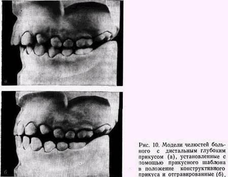 Границы прикусного шаблона для верхней челюсти: впереди — режущие края резцов, сзади — линия, проходящая позади жевательной поверхности коронок последних моляров правой и левой сторон, сбоку — режущий край клыка и жевательная поверхность боковых зубов до их задней границы без перехода на вестибулярную поверхность. При изготовлении прикусного шаблона для нижней челюсти необходимо, чтобы он доходил до подъязычной области, перекрывал режущие края нижних резцов, клыков и жевательную поверхность боковых зубов. Второй этап — определение конструктивного прикуса. При этом имеют значение разновидности зубочелюстно-лицевых аномалий и степень их выраженности. Это влияет на выбор конструкции регулятора функций. При нейтральном глубоком прикусе резцы устанавливают в краевом смыкании. При дистальном прикусе решают вопрос, насколько можно выдвинуть нижнюю челюсть вперед так, чтобы при этом не было перенапряжения мышц. Нижнюю челюсть можно выдвинуть до краевого смыкания резцов, если несоответствие в смыкании боковых зубов не превышает половины ширины коронки премоляра (3 мм) (рис. 10, а, б). При дистальном прикусе большей выраженности, т. е. при несоответствии в смыкании боковых зубов более чем на половину ширины коронки премоляра и при сагиттальной щели больших размеров первоначально выдвигают нижнюю челюсть на 2— 3 мм и лишь после достижения ее роста при повторном изготовлении аппарата ее снова перемещают вперед на такое же расстояние. При мезиальном прикусе передние зубы разобщают с помощью окклюзионных накладок на боковые зубы до ликвидации обратного резцового перекрытия так, чтобы не препятствовать вестибулярному перемещению верхних резцов. Одновременно стремятся переместить нижнюю челюсть максимально назад, это особенно важно при ее привычном смещении вперед или вперед и в сторону. В случае несовпадения средней линии между центральными резцами верхней и нижней челюстей в результате смещения последней без значительных морфологических изменений в височно-нижнече-люстных суставах при определении конструктивного прикуса следует устранить такое смещение. Лечение с помощью регулятора функций способствует нормализации положения нижней челюсти и устранению асимметрии лица. Если же несовпадение средней линии между резцами обусловлено их неправильным расположением, то перемещать нижнюю челюсть до совпадения средней линии между ними не следует. Ее фиксация в принужденном положении может привести к нежелательным нарушениям в области височно-нижнечелюстных суставов. Перед определением конструктивного прикуса больному объясняют, как нужно правильно установить нижнюю челюсть, рекомендуют потренироваться перед зеркалом. На жевательную поверхность прикусного шаблона накладывают полосу разогретого воска толщиной 1,5—2 мм и приклеивают ее. Прикусной шаблон вводят в рот, определяют конструктивный прикус, воск остужают в полости рта струёй холодного воздуха из компрессора или холодной воды. Необходимо следить, чтобы нижняя челюсть была правильно установлена по отношению к средней линии лица. Далее с воскового шаблона срезают отпечатки слизистой оболочки ретромолярной и туберальной областей, поскольку они затрудняют составление моделей челюстей в конструктивном прикусе. Пользуясь шаблоном, устанавливают гипсов