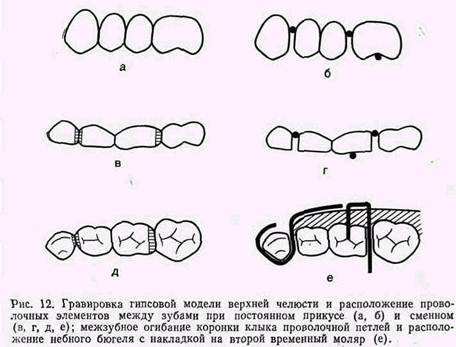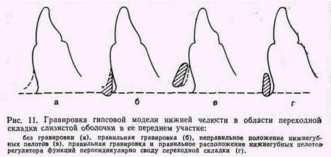 слизистой оболочки в переднем участке по направлению ската альвеолярного отростка вниз на глубину до 5 мм (рис. 11) по обе стороны от уздечки нижней губы. Если гравировка модели сделана глубже, чем это необходимо, то нижний край губных пелотов, сделанных из пластмассы, легко укоротить, удлинить же их значительно труднее. Если возникает такая необходимость, то следует сделать новые пелоты. Боковые щиты должны способствовать развитию апикального базиса зубной дуги в трансверсальном направлении. Поэтому модель верхней челюсти гравируют в области первых премоляров и клыков, иногда бугров верхней челюсти на уровне переходной складки слизистой оболочки (см. рис. 10). Модель нижней челюсти в боковых участках переходной складки гравируют лишь в отдельных случаях, так как эта область преддверия полости рта обычно отображается на оттиске в полном объеме. Затем гравируют гипс между боковыми зубами. Это необходимо для того, чтобы участки небной и лингвальной дуг, проволочных петель на клыки и небного бюгеля при их повороте с вестибулярной поверхности альвеолярного отростка на небную или подъязычную располагались между соответствующими зубами, способствовали лучшей стабилизации аппарата и по показаниям мезиальному и дистальному перемещению-зубов (рис. 12). При лечении мезиального прикуса гравировка гипсовой модели верхней челюсти требуется только в области переходной складки,. особенно в переднем участке (рис. 13). Это желательно делать & присутствии больного, чтобы можно было пропальпировать уровень расположения переходной складки слизистой оболочки и сравнить с отгравированными моделями челюстей. Гравировку проводят с помощью зуботехнического шпателя и штихеля. После этого очерчивают границы регулятора функций, изображают отдельные его детали. Передняя граница бокового щита FR-I и FR-II на верхней челюсти проходит от переходной складки слизистой оболочки до окклюзионной поверхности зубов между клыками и первыми пре»