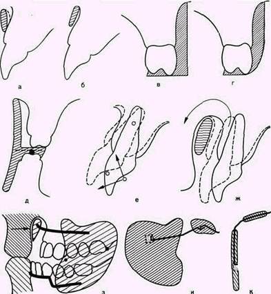 Рис. 13. Соотношение детален регулятора функций Ilia типа с альвеолярными отростками и зубами верхней и нижней челюстей: а — недостаточная гравировка гипсовой модели и неправильное положение верхнегубных пелотов, б — правильная гравировка и правильное положение верхнегубных пелотов, в — правильное, г — неправильное расположение восковых прокладок на боковой поверхности альвеолярного отростка и жевательной поверхности боковых зубов на модели верхней челюсти, д—боковой щит, окклюзионная пластмассовая и проволочная накладки на постоянный нижний моляр—боковой щит должен прилегать к нижней зубоальвеолярной дуге а отстоять от верхней; е — удлинение зубоальвеолярной дуги под воздействием протрагирую-щей проволоки; ж — удлинение зубоальвеолярной дуги и ее апикального базиса под воздействием верхнегубных пелотов; з — изменение расположения губ при пользовании регулятором функций; и, к — перемещение вперед верхнегубных пелотов за счет вытяжения соединительных проволок, расположенных между верхнегубными пелотами и боковыми щитами. При аномалиях прикуса развитие челюстей в трансверсальном направлении обычно задерживается, поэтому боковые щиты не должны касаться альвеолярного отростка верхней челюсти, а в FR-I и FR-II и нижней челюсти. Для этого на гипсовые модели челюстей накладывают и прикрепляют прокладки из воска, вырезанные с учетом вышеописанных границ. Их толщину избирают индивидуально в зависимости от степени сужения зубных дуг, что определяют на основании измерения моделей челюстей. Однако толщина