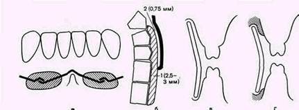 Рис. 14. Схематическое изображение деталей FR-I. а—форма и расположение нижнегубных пелотов и соединительных проволок, б—толщина восковой прокладки (1) и отстояние проволочных элементов (2) от ее наружной поверхности, в — расположение бокового щита, простирающегося до глубокой части переходных складок слизистой оболочки, г — при коротком боковом щите мягкие ткани щеки попадают в пространство между щитом и поверхностью альвеолярного отростка (по R Frankel). восковой прокладки не должна превышать 2,5 мм (см. рис. 14, б, в, г.). В области зубов необходим более толстый слой воска, чтобы достигнуть большего расширения зубных рядов. В области переходной складки он должен быть тоньше. Кроме того, делают щит из пластмассы, повторяющий форму альвеолярного отростка. При значительном недоразвитии апикального базиса зубных дуг одного регулятора функций недостаточно. При изготовлении первого аппарата на модели челюстей наслаивают воск меньшей толщины, чем требуется для нормального расширения базиса челюсти. При изготовлении нижнегубных пелотов в FR-I и FR-II восковых прокладок не делают, так как при дистальном перемещении выдвинутой нижней челюсти образуется промежуток между губными пелотами и альвеолярным отростком. Для верхнегубных пелотов в FR-III, наоборот, требуются восковые прокладки толщиной 2—2,5 мм, чтобы готовые пелоты повторяли угол наклона альвеолярного отростка в области. верхних передних зубов. После изготовления прокладок и удаления излишков воска его неровности сглаживают с помощью пламени горелки. Охлажденный воск натирают мокрым ватным тампоном до блеска, благодаря чему внутренняя поверхность пластмассовых боковых щитов и губных пелотов регулятора функций становится гладкой и ее не полируют. Боковые восковые прокладки разрезают на уровне межокк-люзионного пространства, что позволяет разъединить гипсовые модели челюстей для удобства изгибания и укрепления на них проволочных деталей. Для изготовления проволочных деталей для разных типов регуляторов функций применяют стальную нержавеющую ортодонти-ческую проволоку диаметром 0,6—1,1 мм. Опорные, соединительные и фиксирующие элементы в основном делают из проволоки 0,9— 1,1 мм и только активно действующие пружинящие дуги и пружины, предназначенные для механотерапии, делают из тонкой проволоки 0,6—0,8 мм. Обычно используют набор ортодонтических щип- дов (крампонные, «трехклювные», плоско- и круглогубцы). Губки щипцов должны быть закруглены, что позволяет избежать поломок проволочных деталей во время их изготовления и при коррекции регулятора функций в период пользования им. Концы проволочных деталей, закрепляемые в пластмассе, должны находиться в середине ее толщины на расстоянии 0,75 мм от наружной и внутренней поверхностей щита или пелота. Толщина щитов и пелотов не должна превышать 2,5 мм. Она образуется за счет толщины проволоки 0,9 мм, а также наружного и внутреннего слоев пластмассы по 0,75 мм. Необходимо, чтобы концы всех проволочных деталей располагались на равном расстоянии — 0,75 мм от поверхности модели челюсти и восковых прокладок. Части проволочных деталей, свободные от пластмассы, должны отстоять от слизистой оболочки приблизительно на 1,5 мм. Их по возможности располагают в естественных углублениях наружной поверхности альвеолярного отростка, чтобы предотвратить тр