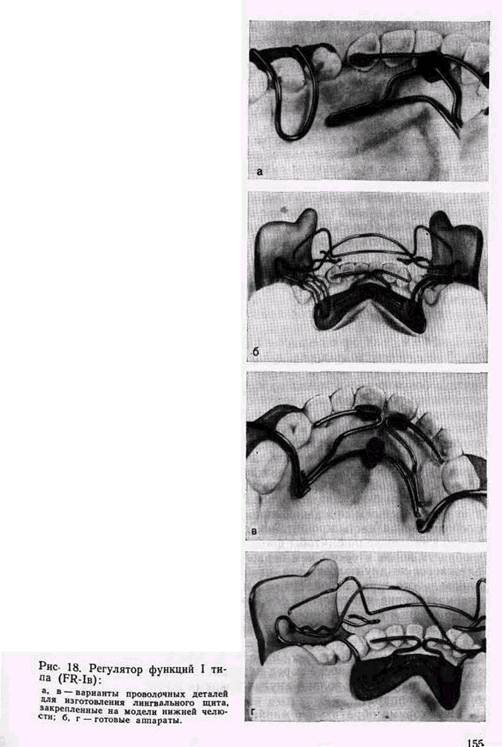 функций с гипсовых моделей челюстей. На сохранившихся моделях можно проверить правильность изготовления аппарата и в случае необходимости сделать соответствующие поправки. Края пластинки не должны быть острыми, их необходимо равномерно округлить. Это особенно важно при обработке краев губных пелотов. Все излишки пластмассы удаляют фрезой. Форма пе-лотов должна напоминать параллелограмм с закругленными углами. Край пелота, направленный к переходной складке, округляют, а противоположный — истончают, чтобы они в поперечном сечении напоминали форму падающей капли (FR-I, FR-II) -или восклицательного знака (FR-III). Карборундовым камнем сглаживают острые и выступающие из пластмассы концы проволочных деталей. На боковых щитах делают округлые вырезки для щечных тяжей. Аппарат шлифуют и полируют. Перед припасовыванием регулятора функций во рту больного оценивают правильность технического изготовления и отделки аппарата. При этом обращают внимание на границы боковых щитов и пелотов на соответствие необходимым требованиям проволочных деталей. При припасовке регулятора функций следует учитывать, что в первое время он может пружинить в тех участках, где была сделана гравировка гипсовых моделей челюстей. По показаниям тщательно укорачивают выступы боковых щитов в области верхних премоляров и клыков. Аппарат не должен вызывать болевых ощущений. Однако в адаптационный период рекомендуют пользоваться им 1 ч днем в течение 2 нед в свободное от занятий в школе время. Первую коррекцию делают через 2—3 дня после сдачи регулятора функций, обращая особое внимание на те участки, где была сделана гравировка гипсовых моделей челюстей. Если видна гиперемия сосудов слизистой оболочки, но нет ее повреждения, то это нормальная реакция. Укорочение щитов и пелотов в этом месте может ухудшить качество аппарата. Если больной может пользоваться им более 1 ч днем в первые 2 нед, то можно рекомендовать надевать его 3— 4 раза в день на 1 ч. Желательно читать вслух с регулятором функций во рту. Рекомендуется сразу же приобрести футляр для хранения аппарата. Обычно для этой цели подходит пластмассовая, но лучше металлическая мыльница, в которой регулятор функций следует хранить в сухом виде. Чистить аппарат желательно зубной щеткой с мылом или зубной пастой не реже 1 раза в день, обмывая его теплой, но не горячей водой. Металлические детали протирают 2 раза в неделю тампоном» смоченным спиртом или одеколоном. Не рекомендуется пользоваться аппаратом в школе или детском саду, во время спортивных занятий и соревнований, пока он не полностью освоен. Не следует носить регулятор функций в кармане без футляра, а также давать его осматривать посторонним или примерять сверстникам. 7.3. ОСНОВНЫЕ КОНСТРУКЦИИ РЕГУЛЯТОРОВ ФУНКЦИЙ И ОСОБЕННОСТИ ТЕХНОЛОГИИ ИХ ИЗГОТОВЛЕНИЯ •с, Основные типы регулятора функций и их разновидности: тип I— (FR-Ia, FR-Ib, FR-Ic), тип II, тип III (FR-IIIa. FR-IIIb) и тип IV (FR-IV). • При рассмотрении клинико-лабораторных этапов изготовления этих ортодонтических аппаратов описаны только их конструктивные и технические особенности. 7.3.1. Регулятор функций 1 типа FR-Ia состоит из 2 боковых вестибулярных щитов, 2 нижнегубных пелотов, соединенных между собой проволочной скобой, а со щитами — проволочными кронштейнами, вестибулярной дуги для верхних резцов, петель на верхние кл
