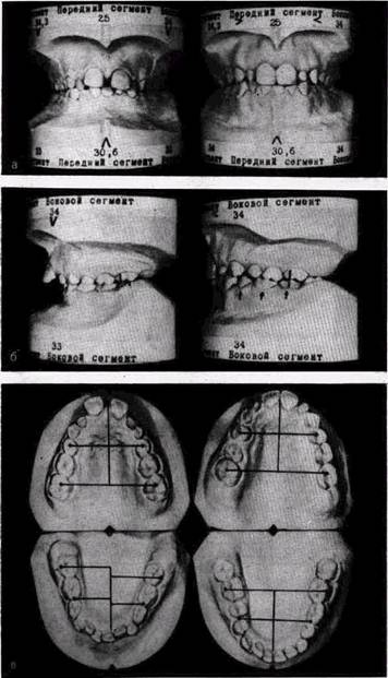 На моделях челюстей карандашом маркируют линии отсчета, срединные точки на режущих краях резцов, буграх клыков, а также измерительные точки Пона на первых пре-молярах (или временных молярах) и первых постоянных молярах. По величине перпендикуляров, проведенных из маркированных точек на линии отсчета, судят о расположении зубов. Определяют общую длину зубных дуг (Lo и Lu) по размеру перпендикуляров, опущенных из срединных точек режущих краев резцов на линию, проведенную через точку Пона на первых постоянных молярах, вычисляют различия в длине зубных дуг верхней и нижней челюстей (Lo—Lu), разницу между размерами ширины зубных дуг в области верхних и нижних клыков (В3|3— В3|3). ~ Оценка положения зубов правой и левой половины зубных рядов путем измерений от линий отсчета позволяет: 1 — определить асимметрию их положения в сагиттальном и трансверсальном направлениях, что важно для уточнения степени выраженности нарушений, трудности их устранения и планирования лечебных мероприятий; 2—сопоставить размеры с целью оценки изменений, достигнутых в процессе лечения глубокого прикуса, а также происшедших после его окончания до проверки отдаленных результатов. Ю. К. Петрова (1983) предложила по размерам, полученным на моделях челюстей пациентов в различное время обследования (до лечения, после его окончания и при проверке отдаленных результатов), графически изображать форму зубной дуги, а также форму, которая должна быть в норме. Для этого на миллиметровой бумаге чертят систему координат, где ось ординат—срединная линия челюстей (RR'), ось абсцисс для верхней зубной дуги—линия, проведенная через срединную точку резцового сосочка (РР'), перпендикулярно линии RR', для нижней—линия, проведенная через точку Пона на дистально расположенном моляре (ММ'). На оси ординат откладывают размеры, отражающие сагиттальное