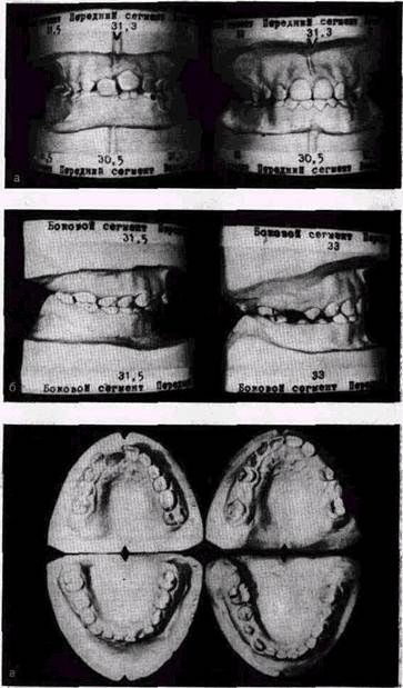 Рис. 35. Диагностические модели челюстей Оли Л-ой: -слева — до лечения регулятором функций I типа дистального прикуса с протрузией верхних резцов, справа — после его устранения. Несоответствие размеров S1 и Si, мезиальное перемещение верхних боковых зубов способствовало сужению зубных дуг и тесному положению 'ЯИЖНИХ резцов. После лечения нижние боковые сегменты увеличивались в результате зубо-альвеолярного удлинения.