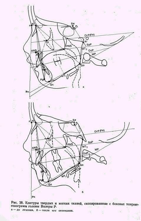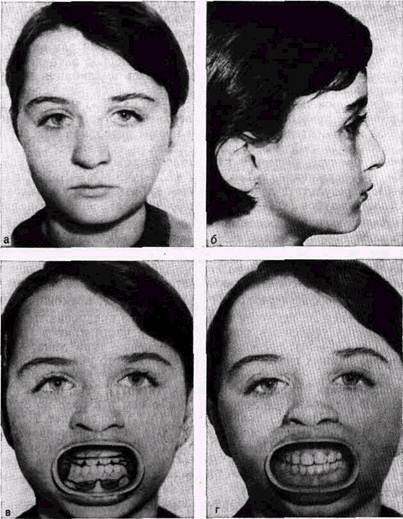 Рис. 37. Наташа Х-на после лечения: ч, б—гармоничная форма лица, в—регулятор функций II типа в полости рта перед окончанием лечения, г — прикус нормализован. 8.6.2. Результаты телерентгенологического изучения лицевого скелета Сравнение данных краниометрии до и после лечения сменного и постоянного дистального прикусов между собой и относительно возрастной нормы показало, что после 7 лет еще продолжается активный рост костей мозгового отдела черепа, а интенсивность прироста костной ткани больше в 1,5—2 раза по сравнению с ди-