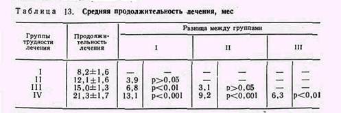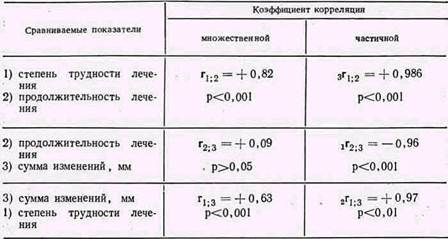 Таблица 14. Коэффициенты корреляции между степенью трудности лечения, его продолжительностью и суммой изменений, происшедших в процессе лечения