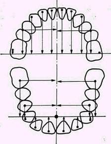 Рис. 40. Графическое изображение форм зубных дуг Наташи С. до лечения нейтрального глубокого прикуса (слева) и после его окончания (справа). Непрерывная линия—форма имеющихся зубных дуг; пунктирная линия—форма зубных дуг при индивидуальной норме (объяснение в тексте). расположение зубов, на оси абсцисс—размеры, отражающие их трансверсальное расположение. Из точек восстанавливают перпендикуляры, места пересечения которых соответствуют расположению измеряемой точки каждого верхнего и нижнего зуба. Полученные точки соединяют линиями (рис. 40). Изображение форм зубных дуг, имевшееся до лечения, в процессе лечения и после окончания переносят на прозрачную перлоновую пленку и сопоставляют по линиям отсчета с целью выявления изменений расположения зубов. На основании данных клинического обследования пациентов с глубоким прикусом и изучения диагностических моделей их челюстей Ю. К. Петрова (1984) выделила 3 типичных разновидности сочетания глубокого прикуса с нарушениями строения зубоальвео-•лярных дуг: 1) правильное расположение коронок верхних резцов, ретрузия нижних, укорочение нижней зубной дуги, сужение зубных дуг, наибольшее в области нижних клыков и премоляров; 2) протрузия верхних резцов и удлинение верхней зубной дуги, нормальная длина или укорочение нижней зубной дуги, сужение зубных дуг, наибольшее в области нижних клыков и премоляров; 3) ретрузия верхних и нижних резцов, тесное положение передних зубов, укорочение зубных дуг, сужение нижней зубной дуги в области клыков и премоляров. При нейтральном соотношении зубных дуг обычно наблюдают зубоальвеолярную форму глубокого прикуса, при дистальном и ме-зиальном — как зубоальвеолярную, так и гнатическую. 9.1.2. Разновидности глубокого прикуса (по данным изучения боковых телерентгенограмм головы) С помощью анализа боковых ТРГ головы Ф. Я. Хорошилкина (1976), А. С. Щербаков (1980), A. Bjork (1977), Н. М. Opdebeek, W. Н. Bell (1978), Th. Rakosi (1979) и др. определили глубокий прикус как зубочелюстную аномалию, обусловленную дисгармонией роста и развития челюстно-лицевого скелета, при которой нарушаются соотношения зубов, челюстей и лицевого скелета в вер-чикальном и сагиттальном направлениях. С целью оценки строения зубочелюстно-лицевого скелета анализируют угловые и линейные размеры в вертикальном и сагиттальном направлениях, их соотношения, которые сопоставляют со средними значениями, полученными при изучении боковых ТРГ головы обследованных с ортогнатическим прикусом [Schwarz А. М.,. 1936; Hasund A., Janson I., 1978; Хорошилкина Ф. Я., 1978, 1982; Date: 2015-05-19; view: 979; Нарушение авторских прав |