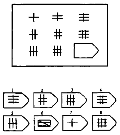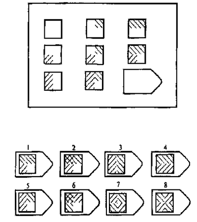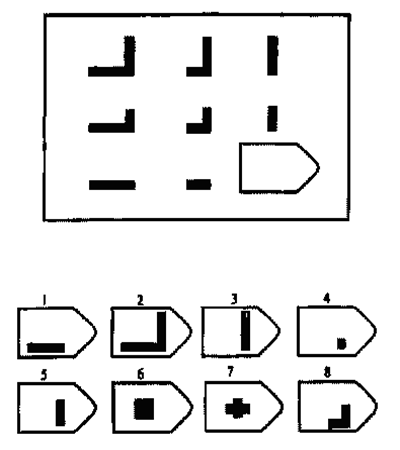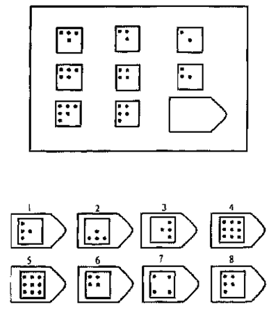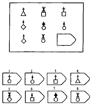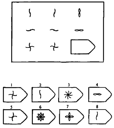 01 02 03 04 05 06 07 08 09 10 11 12 Прогрессивные матрицы Равена (тест Равена) 17. «Найди недостающую деталь» (матрицы Дж. Равена) Направлены на изучение сформированности процессов анализа и синтеза. Оборудование: 12 планшетов серии А и АВ. Желательно, чтобы карточки были цветными, тогда ребенок меньше устает. Инструкция для П.: П. учитывает количество правильных решений данной задачи. Если ребенок легко справляется с первыми четырьмя работами, то можно сразу дать №7, где необходимо распределить внимание на две детали, расположенные в горизонтальной и вертикальной плоскостях. Инструкция для Р.: «Сейчас я покажу тебе картинку. Представь себе, что мама купила коврик и повесила настену. Утром ты просыпаешься и видишь, что в коврике дырка. А этот кусочек взял и убежал, и спрятался среди других 6-ти деталей. Помоги мне найти беглеца!» / 1 вар./ Если ребенок молчит, то П. добавляет:«Если ты найдешь этот кусочек и “мысленно” поставишь его на место, то коврик получится целым, а если нет,то латанным». По всем методикам П. имеет право оказывать косвенную помощь, которая заключается в таких вопросах, как: - Ты все правильно сделал? Причем, более 2-х раз косвенная помощь не оказывается. Date: 2015-05-19; view: 1360; Нарушение авторских прав |