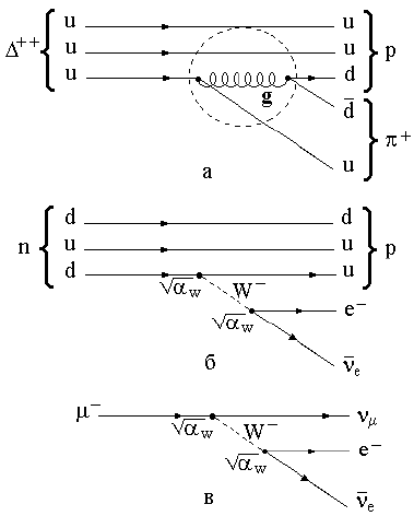Схематическое изображение разных взаимодействий, происходящих на кварковом уровне, показано на рис. 16.