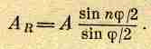 где j — разность фаз соседних осцилляторов для некоторого направления лучей. В данном частном случае j=a+2pd1/2sinq. Вычислим сумму R. Для этого воспользуемся геометрическим способом сложения. Длина первого слагаемого А, а его фаза равна нулю; длина второго также А, а фаза его равна j. Следующее слагаемое имеет снова длину А и фазу, равную 2j, и т. д. В конце концов получается часть правильного многоугольника с n сторонами (фиг. 30.1).