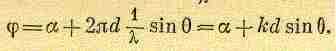 (30.4) Рассмотрим сначала случай a=0. Все осцилляторы колеблются с одной фазой; требуется найти интенсивность их излучения как функцию угла В. Подставим с этой целью j=kdsin q в формулу (30.3) и посмотрим, что получится в результате. Прежде всего, при j=0 возникает максимум. Значит, осцилляторы, колеблющиеся с одной фазой, дают мощное излучение в направлении 0 =0. Интересно узнать, где находится первый минимум.