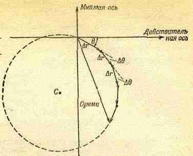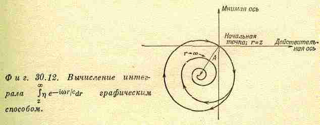 постепенно уменьшается по мере удаления от центра (или обращается в нуль вне некоторой границы неправильной формы, так что для достаточно больших r вклад всего кольца шириной dr равен нулю), то коэффициент ню в точном интеграле убывает, стремясь к нулю. Поскольку длина добавляемых отрезков в этом случае уменьшается, а угол Dq остается тем же самым, график кривой, соответствующей интегралу, будет иметь вид спирали. Спираль оканчивается в центре первоначальной окружности, как изображено на фиг. 30.12. Физически правильное значение интеграла дается величиной А, которой на схеме соответствует расстояние от начальной точки до центра окружности, равное как нетрудно убедиться.