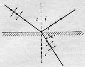 Фиг. 33.4. Отражение линейно поляризованного света под углом Врюстера. Направление поляризации дается пунктирными стрелками: круглые точки изображают поляризацию, перпендикулярную плоскости страницы.