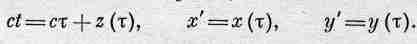 (34.5) Нам нужно найти х' и у' как функции t, а не т, и это достигается следующим образом: как подсказывает уравнение (34.5), нужно взять истинное движение заряда и добавить время т, умноженное на константу (скорость света). На фиг. 34.2 показано, что это означает. Возьмем истинную траекторию заряда (показанную слева) и представим себе, что по мере движения заряд удаляется от точки Р со скоростью с (здесь нет каких-либо релятивистских сокращений и подобных вещей; это просто математическое добавление ст). Таким путем получится новая траектория, где по оси абсцисс отложено ct, как показано на рисунке справа. (На рисунке изображена траектория довольно сложного движения в плоскости, но движение может происходить не только в плокости.)
