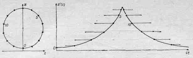 Смысл приведенной процедуры состоит в том, что горизонтальное расстояние в правой части фиг. 34.2 в отличие от левой оказывается равным не z, a z+cт, т. е. ct. Мы нашли, таким образом, график изменения х' (и у') в зависимости от t\ Осталось только определить ускорение на кривой, т. е. продифференцировать ее дважды. Отсюда окончательно заключаем: чтобы найти электрическое поле движущегося заряда, нужно взять траекторию движения и заставить двигаться каждую ее точку от точки наблюдения со скоростью с; полученная кривая дает положения х' и у' как функцию t. Ускорение на этой кривой определит электрическое поле в зависимости от t. Можно, если угодно, представить себе, что вся эта «твердая» кривая движется вперед со скоростью с сквозь плоскость зрения, так что точка пересечения с плоскостью зрения имеет координаты х' и у'. Ускорение этой точки и определит электрическое поле! Полученное решение будет не менее точно, чем формула, из которой мы исходили,— это просто ее геометрическое представление. Если источник совершает относительно медленное движение, как, например, медленно колеблющийся вверх и вниз осциллятор, то при растягивании этого движения со скоростью света получится простая синусоидальная кривая. Отсюда можно получить формулу для поля, создаваемого осциллирующим зарядом, которую мы видели неоднократно. Более интересный пример — это электрон, движущийся по окружности со скоростью, близкой к скорости света. Если наблюдатель находится в плоскости движения электрона, запаздывающее движение x'(t) имеет для него вид, изображенный на фиг. 34.3. Что это за кривая? Если мы представим себе радиус-вектор, проведенный из центра окружности к заряду, и если мы продолжим эти радиальные линии чуть-чуть за заряд (совсем капельку, если заряд движется быстро), то мы придем к точке, которая движется со скоростью света с. Поэтому результирующее движение есть движение заряда, прикрепленного к колесу, которое катится назад (без скольжения) со скоростью с;
