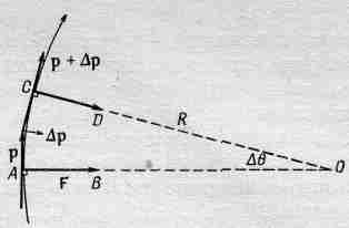 располагаются так, как показано на фиг. 34.4. Поскольку сила перпендикулярна скорости, кинетическая энергия, а значит, и абсолютная величина скорости остаются постоянными. Действие магнитного поля сводится только к изменению направления движения. За малый промежуток времени Dt вектор импульса изменится на величину Dр = F•Dt, направленную перпендикулярно импульсу, т. е. вектор импульса р повернется на угол Dq = Dр/р =qvB D t/p, так как |F| = qv•|В|. Но за то же время электрон пройдет расстояние Ds = v D t. Две прямые, АВ и CD, очевидно, пересекутся в точке О, для которой ОА = ОС = R, причем Ds = RDq. Комбинируя написанные формулы, мы получаем RDq/Dt=Rw =v=qvBR/p, откуда