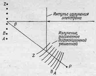 Итак, если даже медленно движущийся электрон излучает радиоволны длиной порядка 20 м, то релятивистские эффекты сокращают длину волны настолько, что мы можем увидеть излучение! Очевидно, свет должен быть поляризован перпендикулярно однородному магнитному полю. Предположим далее, что мы направили подобный пучок света (импульсы излучения возникают через большие промежутки времени, так что для простоты возьмем один такой импульс) на дифракционную решетку, состоящую из множества рассеивающих линий. Какая картина возникнет после прохождения излучения через решетку? (Казалось бы, мы должны увидеть красные, синие полосы света и т. д., если вообще мы будем видеть свет.) А что мы увидим на самом деле? Импульс излучения попадает прямо на решетку, и все осцилляторы на линиях решетки начинают одновременно бешено колебаться туда и обратно. При этом они излучают в разных направлениях, как показано на фиг. 34.5. Но точка Р расположена ближе к одному концу решетки, и поэтому излучение попадает в нее сначала от А, потом от В и т. д., наконец, последним приходит импульс от самой крайней линии. В итоге совокупность всех отраженных волн принимает такой вид, как показано на фиг. 34.6,а. Это электрическое поле, состоящее из целого ряда импульсов, очень походит на синусоидальную волну, причем длина волны есть расстояние между соседними импульсами, точь-в-точь как у монохроматической волны, падающей на дифракционную решетку! Таким образом, мы действительно увидим свет окрашенным. Но те же аргументы, казалось бы, позволяют думать, что «импульсы» любой формы создадут видимый свет.