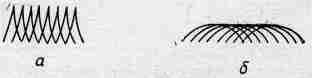 Фиг. 34.6. Суммарное электрическое поле от совокупности острых импульсов (а) и импульсов гладкой формы (б).