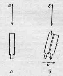 Фиг, 34.12. Удаленный источник света S. а — наблюдаемый через неподвижный телескоп; б — наблюдаемый через телескоп, движущийся в боковом направлении. Горизонтальное расстояние, которое мы считали равным vt, неподвижный по отношению к Земле наблюдатель найдет равным совсем другой величине, так как он пользуется, с нашей точки зрения, «сжатой» линейкой. Из-за эффекта сокращения возникает совсем другое соотношение: