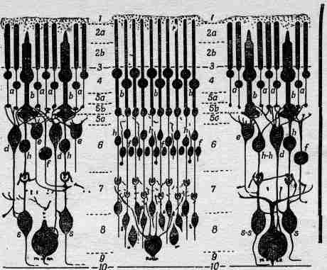 На фиг. 35.2 в увеличенном масштабе показана структура сетчатки. Различные части сетчатки имеют разную структуру. На периферических частях сетчатки наиболее часто встречаются удлиненные объекты, называемые палочками. Ближе к желтому пятну, кроме палочек, попадаются еще колбочки. Позже мы опишем структуру этих элементов. Чем ближе к желтому пятну, тем больше становится колбочек, а в самом желтом пятне фактически имеются одни только колбочки, лежащие столь тесно, что здесь они много мельче, или уже, чем в других местах сетчатки. Следовательно, в центре поля зрения мы видим с помощью колбочек, а на периферии в восприятии света участвуют палочки. Интересно, что любая чувствительная к свету клетка в сетчатке не связана со зрительным нервом непосредственно, а соединена с другими клетками, которые в свою очередь соединены между собой. Существует несколько типов клеток: одни несут информацию к зрительному нерву, а другие связаны между собой в основном в «горизонтальном» направлении. Всего имеется четыре типа клеток, но мы сейчас не будем об этом говорить подробно, а только подчеркнем основную идею: что световой сигнал уже на этом этапе «продумывается». Иначе говоря, информация, полученная от различных клеток, не сразу поступает в мозг от каждой точки в отдельности, а частично осмысливается в сетчатке путем комбинирования информации от нескольких зрительных рецепторов. Важно понять, что сам глаз выполняет часть функций осмысливания, свойственных головному мозгу. Date: 2015-05-19; view: 469; Нарушение авторских прав |