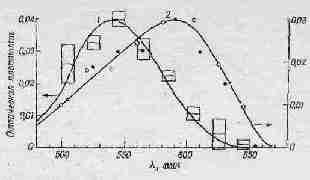 Что можно сказать о сравнении полученных кривых со свойствами настоящего глазного пигмента? Пигменты, извлекаемые из сетчатки, главным образом состоят из одного вида, называемого зрительным пурпуром. Его самые примечательные свойства заключаются в том, что он присутствует в глазах почти всех позвоночных животных и его кривая поглощения почти точно совпадает с кривой чувствительности глаза.