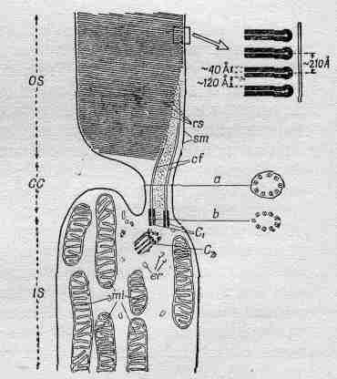 Посмотрим теперь подробнее, что происходит в палочках сетчатки. На фиг. 36.5 показана микрофотография середины палочки (конец ее выходит вверх за пределы снимка). Справа в увеличенном виде слой за слоем видны плоские структуры, содержащие родопсин (зрительный пурпур) — красящее вещество, или пигмент, который, собственно, и обусловливает функцию палочек. Родопсин представляет собой большие молекулы белка, содержащего специальную группу, называемую ретиненом, которая может быть отщеплена от белка, что, несомненно, и является главной причиной поглощения света. Нам пока не понятно, почему эти структуры плоские, но весьма возможно, что это сделано для того, чтобы молекулы родопсина лежали параллельно друг другу. Химия этого явления известна сейчас довольно хорошо, но, кроме того, возможно, что здесь принимает участие и физика. Может оказаться, что все молекулы располагаются в своего рода ряд, и когда одна из них возбуждается, то вылетевший при этом электрон (или просто волна возбуждения) доходит до некоторого места в конце структуры и порождает сигнал или что-нибудь аналогичное. Это очень важная область, и она еще совсем не разработана. Это поле деятельности для биохимии и физики твердого тела или чего-то в этом духе.