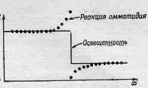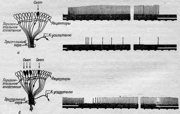 Прежде всего нужно понять, какого сорта информация может передаваться по нервам. По нерву передается нечто вроде возмущения электрической природы, которое может быть легко зарегистрировано. Это некое волнообразное возмущение, которое бежит по нерву и вызывает на другом его конце какой-то эффект. Информацию переносит длинный отросток нервной клетки, называемый аксоном, и если один конец аксона возбужден, то по нему бежит «импульс». Далее, если по нерву уже проходит один импульс, то за ним не может немедленно последовать второй. Все импульсы имеют одну и ту же величину, так что, когда нерв сильно возбужден, это вовсе не означает, что по нему бежит больший импульс, а просто увеличивается, число импульсов в 1 сек. Величина же импульса определяется нервным волокном. Это важно усвоить, чтобы понять, что произойдет дальше. На фиг. 36.11, а показан сложный глаз краба-мечехвоста; в нем всего лишь около тысячи омматидиев. Фиг. 36.11, б представляет собой поперечный разрез этой системы. Видны отдельные омматидии и нервные волокна, соединяющие их с мозгом. Но обратите внимание, что даже у этого краба имеются внутренние связи. Они, конечно, гораздо менее сложные, чем в глазе человека, но именно это-то и дает нам возможность изучить подобные связи на простом примере. Давайте рассмотрим такой опыт: наложим на зрительный нерв нашего краба небольшие электроды и осветим только один омматидий; это легко можно сделать с помощью линз. Если мы в какой-то момент времени t0 включим свет и будем измерять возникающие электрические импульсы, то увидим, что после небольшой задержки последует быстрая серия разрядов, частота которых постепенно будет уменьшаться, пока не достигнет какой-то равномерности (фиг. 36.12,а). После выключения света разряды прекращаются. Интересно, что если усилитель остается связанным с тем же нервом, а мы направим свет на другой омматидий, то ничего не произойдет, сигналов не будет. Проделаем теперь другой опыт: осветим первый омматидий и получим те же импульсы, но если теперь мы направим свет еще на другой соседний омматидий, то на короткое время импульсы прекращаются, после чего импульсы «побегут» снова, но с гораздо меньшей частотой (фиг. 36.12, б). Оказывается, что импульсы, возникающие во втором омматидий, затормаживают импульсы первого! Другими словами, хотя каждый нерв и несет информацию о своем омматидий, количество этой информации подавляется сигналами от другого омматидия. Например, когда более или менее равномерно освещен весь глаз, то сигнал, пришедший от любого отдельного омматидия, будет относительно слабым, ибо он подавлен множеством других сигналов. Торможение аддитивно, т. е. если мы осветим несколько соседних омматидиев, торможение будет очень сильным.
