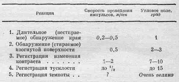 Торможение оказывается большим, если омматидии расположены ближе, но если они достаточно удалены друг от друга, то торможение практически сводится к нулю. Таким образом, торможение аддитивно и зависит от расстояния. Это первый пример, когда информация от различных частей глаза перерабатывается в нем самом. Если подумать немного, то можно понять, что этот механизм предназначен для усиления контраста на краях объекта, ибо если часть предмета освещена, а часть нет, то омматидии, направленные на освещенную область, дают импульсы, которые затормаживаются всеми соседними омматидиями, видящими освещенную область, так что они относительно слабы. С другой стороны, омматидии, видящие границу световой области и дающие «белый» сигнал, хотя и подавлены своими соседями, но тех не столь уж много, ибо некоторые из них совсем темные (не видят света), в результате чего сигнал оказывается более сильным. В итоге получается кривая, подобная изображенной на фиг. 36.13. Краб как бы видит «усиленный» контур. Однако тот факт, что существует такое «усиление» контура, известен уже давно. Это действительно замечательная вещь, которая неоднократно обсуждалась психологами. Чтобы изобразить предмет, нам достаточно нарисовать лишь его контур. Ведь мы привыкли видеть картины, на которых изображены одни только контуры! Но что же такое контур? Ведь это просто граница между темным и светлым или между одним цветом и другим. В самом деле, это вовсе не что-то определенное. Можно думать, что угодно, но никакой линии вокруг предмета нет! Нет, все это только наша выдумка. Теперь мы начинаем понимать, почему нам достаточно контура, чтобы представить себе весь предмет. По-видимому, наши глаза тоже работают, подобно глазам мечехвоста, разумеется, гораздо более сложно, но все же аналогично. Наконец, я вкратце опишу более сложные опыты, очень красивые, и трудные, которые были проделаны над лягушкой. При выполнении их в зрительный нерв лягушки вводились миниатюрные искусно сделанные нитеобразные зонды и измерялись сигналы, идущие вдоль одного определенного аксона; точно так же как в случае с крабом-мечехвостом, было обнаружено, что информация зависит не просто от одной точки глаза, а является суммой информации, полученных от нескольких частей. Наиболее современная картина операций на глазе лягушки выглядит следующим образом. Можно найти четыре типа различных зрительных нервных волокон, в том смысле, что существуют четыре различных сорта ответных реакций. В этих экспериментах не было вспышек света: лягушка не замечает таких вещей. Она просто сидит, и глаза ее неподвижны до тех пор, пока листок лилии не начнет двигаться. Тогда глаза лягушки движутся как раз так, чтобы изображение оставалось в поле зрения. Однако сама по себе лягушка глазами не ворочает и не ищет, куда девался объект. Если в поле ее зрения движется что-то, напоминающее небольшое насекомое (нужно, чтобы она могла видеть нечто маленькое, движущееся на неподвижном фоне), то обнаруживаются четыре различных сорта нервных волокон, отвечающих на это раздражение. Их свойства приведены в табл. 36.1. Длительное (нестираемое) обнаружение края означает, что если мы внесем предмет с резким краем в поле зрения лягушки, то в тех фоторецепторах, мимо которых он движется, возникает множество импульсов, которые переходят затем в ред