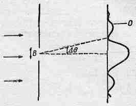 Чтобы понять, почему в квантовой механике появляется неопределенность в положении и (или) в импульсе, рассмотрим два примера. Мы уже видели раньше, что если бы этого не было, если бы можно было параллельно измерять и местонахождение, и импульс какого-то тела, то возник бы парадокс. К счастью, парадокса не возникает, а то обстоятельство, что неопределенность естественным образом вытекает из волновой картины, свидетельствует, что все здесь взаимосвязано. Вот первый пример, показывающий связь импульса и координаты в условиях, которые легко себе представить. Пусть сквозь единственную щель в экране проникают частицы, пришедшие издалека и обладающие определенной энергией. Движутся все они горизонтально (фиг. 38.2). Сосредоточим наше внимание на вертикальной составляющей импульса. У каждой из этих частиц имеется (в обычном классическом смысле) горизонтальная составляющая импульса определенной величины р0. Вертикальная составляющая импульса рy (до того, как частица пройдет сквозь прорезь) также в классическом смысле хорошо известна: частицы не движутся ни вверх, ни вниз, потому что их источник очень удален, значит, вертикальная составляющая импульса частицы в точности равна нулю. А теперь предположим, что ширина щели равна В.