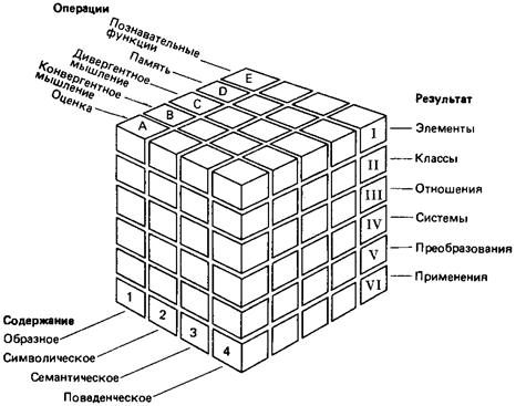 Кубическая модель структуры интеллекта Дж. Гилфорда. Самой «многофакторной» иерархической моделью интеллекта является модель, предложенная Дж.Гилфордом. Она является трехмерной, и в нее входят 120 факторов. К, более чем, 100 факторам подобраны соответствующие тесты для их диагностики. Он ввел понятия конвергентного и дивергентного мышления, как составляющих интеллекта.