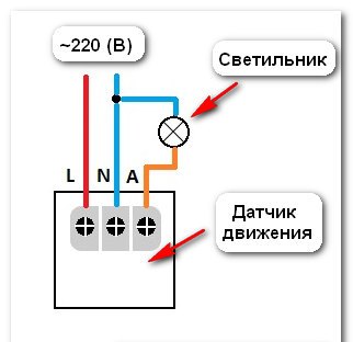 Вариант 1 Первый вариант схемы подключения датчика движения для освещения является стандартным решением. Кстати, такая схема изображена на корпусе самого датчика.