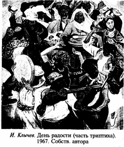 Прошедшая война продолжает волновать как людей старшего поколения, так и молодежь, тех, кто не принимал в ней участия, а в иных случаях еще тогда и не родился. Но знаменательно, что и те, и другие изображают войну прежде всего как величайшую трагедию человечества. В 1966–1968 гг. В. Попков создает триптих «Ой, как всех мужей побрали на войну» («Воспоминание. Вдовы», «Одна», «Северная песня»), который стал живописным памятником всем вдовам, старым и молодым, не дождавшимся прихода своих мужей с полей сражений. Художникам иногда трудно выразить мысль с помощью только одной картины, они прибегают к многочастным произведениям – диптихам, триптихам: триптих молдавского художника М. Греку «История одной жизни», 1967; испанский триптих А. Мыльникова «Тореадор», «Распятие в Кордове», «Смерть Гарсиа Лорки», 1981 г. В связи с именем А.А. Мыльникова сразу возникает мысль о пейзаже, в жанре которого работали многие художники и непейзажисты. В пейзажном жанре по-своему отразился процесс осознания национальных корней, интерес к истории. Пейзажи Мыльникова отличает неизменный профессионализм и, что представляется особенно важным, традиционная именно для русского искусства поэтизация натуры. Особое место в отечественном пейзаже тех лет занимает северный пейзаж. Еще в 60-е годы началось буквально паломничество живописцев на Север, открывший художникам свою неброскую красоту. Художники возвращались из поездок с массой этюдов или уже готовых картин. Так появляются проникновенные пейзажи Никонова, Андронова, Стожарова.