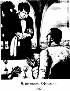 Конечно, каждое новое поколение отличается от предыдущего, и те, кто вступил на стезю искусства в 70–80-е годы, работают и видят мир иначе, чем те, кто, скажем, менял лицо советского искусства в 60-е. В современной живописи нет единого стиля, как един был, например, «суровый стиль», нет жестких канонов в применении тех или иных выразительных средств и приемов. Планы могут быть смещены, перспектива нарушена, объемы уплощены, воздушность и игра светотени изгнаны вовсе, как и тонко нюансированный цвет, уступающий иногда место резко ограниченному, локальному; вместо единой «точки схода» может возникнуть несколько, как в древнерусской иконе. «За плечами» современных художников богатейший опыт поисков и находок, использование традиций древней живописи и приемов фото- и киномонтажа, как это делал в 20-е годы А. Родченко. Вся эта широкая палитра выразительных средств, если только она не самоцельна, выявляет разные творческие индивидуальности и служит созданию художественного образа. В 70–80-е годы на арену выступает поколение, которое во многом определяет лицо советской живописи и сегодняшнего дня: Т. Назаренко, О. Булгакова, Н. Нестерова, А. Волков, В. Рожнев, А. Ситников, В. Орлов и другие талантливые мастера. Современные художники много и интересно – на языке изобразительного искусства – размышляют о традициях, об истории, о понимании красоты в современном мире. Они иначе, чем художники предыдущего десятилетия, понимают образно-выразительные средства и возможности искусства: колорита, композиции, линейного и ритмического строя. Им близок язык символов. Их живописная форма богата театральной зрелищностью, иногда внешними эффектами, но всегда необыкновенно артистична, виртуозна, фантастически изощренна. В ней нет места прямолинейной повествовательности 50-х годов, противопоказанной природе изобразительного искусства. Не случайно среди портретов, исторических и бытовых картин, пейзажей, натюрмортов появляется тема праздника, маскарада, как, например, в картинах Т. Назаренко («Встреча Нового года», 1976). Художник ищет нетрадиционные формы и для исторической картины. Так, в полотне «Декабристы. Восстание Черниговского полка» (1978) персонажи на заднем плане воспринимаются лишь как видение, возникшее у мастера после чтения книг, которые вместе с бумагами и саблями изображены на переднем плане в качестве главных «действующих лиц». Метафора, притча являются обычными формами пластического языка А. Ситникова. Гармония тихого мира его первых картин нарушается настоящей фантасмагорией начиная с середины 70-х годов. Исследователи его творчества правильно пишут, что картинное пространство у него становится «полем борьбы добра и зла, любви и ненависти, разума и глупости, красоты и безобразия, борьбы и смирения, жестокости и доброты, варварства и бессмертия». Он сумел материализовать, пластически выразить духовно-психологические явления – эта черта представляется вообще одной из характерных в искусстве 80-х годов. Цвет у Ситникова никогда не отражает натурных, предметных соотношений, он условен и экспрессивен, построен на напряженных диссонансах, создающих настроение драматическое, мятежное («Сон», 1978, «Шостакович. «Золотой век», 1985).