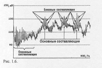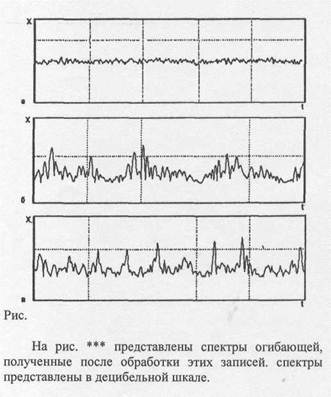 В акустике за нулевой уровень принимаются установленные в ГОСТах уровни звукового давления, скоростей, вибраций и т.п. Для ускорений принимается уровень, измеренный на частоте 1000 Гц и составляющий величину 3-Ю"2 см/с2, что соответствует смещению вибрирующей поверхности при частоте 1000 Гц - 8-Ю"10 см. При этом эффективные значения ускорений, смещений и скоростей при частоте 1000 Гц получают одинаковое значение в децибелах. На рис. **** представлены записи вибраций, полученные для подшипников без дефектов, с неравномерным износом (модуляция) и имеющим раковины на поверхности (удары).