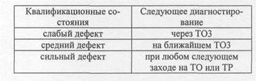баний мощности одних составляющих и стабильность других. Чтобы исключить ошибки необходимо выбирать точки измерения вибраций в узлах машин, в которых доминирует случайная вибрация. 5.6.2. Перечень диагностируемых неисправностей подшипников качения и их квалификационные состояния Оценка технического состояния подшипников производится путём определения относительной количественной оценки развития основных дефектов, возникающих при эксплуатации: - «бой вала» (повышенная вращающаяся нагруз - износ наружного кольца (происходит локально, - раковины, трещины на наружном кольце (диаг - износ внутреннего кольца (зона повышенного - раковины на внутреннем кольце; - износ тел качения и сепаратора (опасные де - раковины и сколы на телах качения (наиболее - проскальзывание кольца подшипника в поса - неоднородный радиальный натяг (дефект сбор - перекос наружного кольца при неправильном - недостаточное количество смазки или грязная - группа дефектов на поверхности качения. количественными пороговыми значениями оценки имеет квалификационные состояния: «слабый дефект» - зарождение дефектов, не препятствующих длительной эксплуатации; «средний дефект» - зарождение дефектов, за которыми необходимо следить при дальнейшей эксплуатации; «сильный дефект» - развитый дефект в узле, который требует частой проверки при эксплуатации; «заменить подшипник» - дальнейшая эксплуатация может привести к его разрушению с последующим «заклиниванием» вращающейся детали - вала или оси колёсной пары. Пороговые значения устанавливаются диагностом при конфигурировании программы анализа и уточняются при эксплуатации на основании статистики (не менее 30 экспертных оценок для каждого уточняемого дефекта). Оценка остаточного ресурса (очередное диагностирование) определяется программой в зависимости от 5.6.4. Периодичность измерений,режимы диагностируемого объекта Периодичность диагностических измерений для подшипников качения определяется двумя способами: 1. Применяется при массовом диагностическом Периодичность измерений задаёт сам диагност на основании данных о среднем ресурсе подшипника в конкретном агрегате. Многолетние исследования показывают, что если в подшипнике нет скрытых дефектов изготовления, его правильно эксплуатируют и в нём нет средних дефектов монтажа и износа, то нижняя граница безаварийной работы составляет 20-25% от его среднего ресурса. Однако, учитывая то, что при неработающей машине могут происходить структурные изменения состояния смазки подшипника, разработчики установили максимальный интервал между диагностическими измерения для подшипников равным 6 месяцам. Если по результатам диагностики в подшипнике не обнаружены средние или сильные дефекты, то производится уменьшение интервала между диагностическими измерениями. При этом рекомендуемый интервал сокращается в 2 раза, т.е. до 3-х месяцев. Если обнаружены два средних и один сложный дефекты, то рекомендуемый интервал снижается ещё в 3 раза. В более сложных случаях необходимо либо сменить подшипник, либо сократить исходный интервал между измерениями в 10 раз. Но в том случае, если вероятность выхода из строя подшипника невелика - это выполняется экспертной программой. В том случае, если количества измерений для выбираемых программой автоматической диагностики не хвата